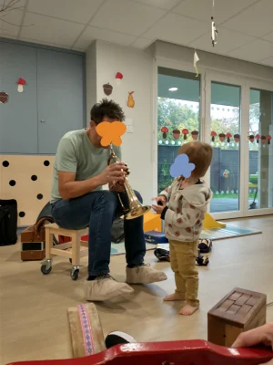Un musicien intervenant joue de la trompette face à un enfant fasciné : un atelier d'éveil musical qui initie les jeunes apprentis à la diversité des instruments et au plaisir de l'écoute active.