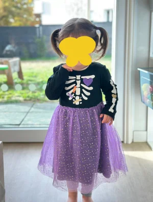 Une petite fille déguisée pour Halloween pose fièrement avec son costume — toutes les occasions festives sont saisies à la crèche pour développer la joie du jeu symbolique et du faire-semblant.