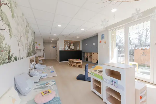 Ouverte en janvier 2025, la micro-crèche de Charvonnex déploie ses 120 m² intérieurs dans un bâtiment agrémenté d'une large baie vitrée qui inonde la pièce principale de lumière naturelle à longueur de journée. L'espace extérieur de 172 m² — généreux pour une micro-crèche — est un véritable privilège pour les sorties en plein air, dès les premiers rayons de soleil de mars. Les 12 enfants accueillis évoluent dans une structure conçue pour leur autonomie : tables et tabourets à leur hauteur, rangements accessibles, coins de jeux identifiés. Le papier peint jungle apporte une touche de couleur et d'imaginaire, transportant les jeunes curieux dans un univers de découverte. Les jeux disponibles — porteurs, cubes de mousse, anneaux d'empilements, livres en tissu — encouragent les explorations motrices et sensorielles des plus jeunes comme des plus grands. Tiffany, auxiliaire de puériculture et directrice depuis l'ouverture, accompagne les familles nouvellement arrivées comme celles qui grandissent avec la crèche, avec une attention particulière portée à l'adaptation progressive de chaque enfant. La crèche est ouverte de 7h45 à 18h30.