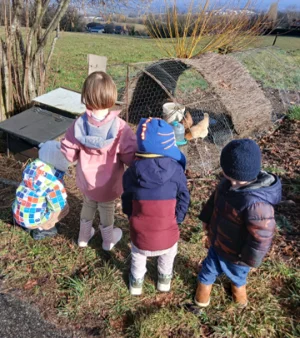 Sortie à la ferme : quatre tout-petits s'approchent d'un mini poulailler pour observer les poules de près, une expérience concrète et émouvante qui éveille la curiosité des plus jeunes vis-à-vis du monde animal.