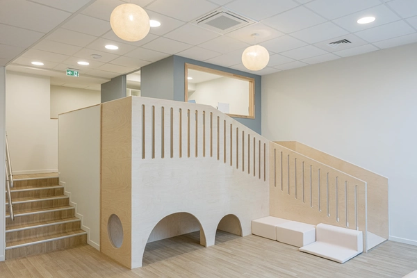 Lumineuse et spacieuse, la crèche de Montreuil accueille 32 enfants dans un espace ouvert sur un patio, entre grands modules de motricité et jardin généreux.