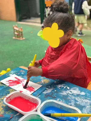 Une petite fille peint une feuille de papier dans le cadre d'un atelier créatif dédié aux fêtes des parents — une façon de valoriser chaque enfant à travers sa propre production artistique.