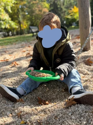 Sortie au parc du quartier : un petit garçon concentré explore une poignée de cailloux et un tamis, découvrant textures et matières avec une curiosité délicieuse et naturelle.