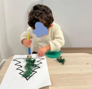 Pinceau en main, les bébés de la crèche d'Alésia décorent leur sapin de Noël avec des couleurs vives et généreuses — un atelier créatif joyeux qui stimule l'imagination et la motricité fine.