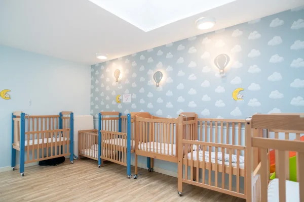 À l'intérieur, les espaces de jeux libres côtoient un coin repos douillet pour les siestes, et des zones d'activités structurées pour les ateliers créatifs. Les jouets proposés — formes géométriques, livres illustrés, matériaux naturels, jeux d'imitation — sont choisis pour stimuler le développement cognitif et moteur des tout-petits.