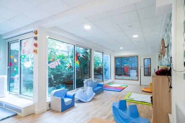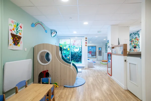 Sur 120 m² intérieurs, la crèche est organisée en espaces distincts et complémentaires. Le patio, véritable atout de cette crèche parisienne, permet aux enfants de profiter de l'air frais, d'observer les plantes et d'expérimenter le dehors en toute sécurité — une connexion à la nature rare et précieuse en milieu urbain. La végétation présente dans cet espace apporte une dimension sensorielle naturelle : toucher les feuilles, sentir les fleurs, observer les saisons qui changent.