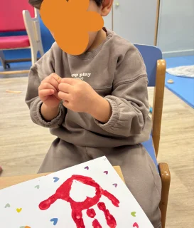 Pour la Saint-Valentin, les enfants de Falguière trempent leur paume dans la peinture et laissent l'empreinte de leur main en forme de cœur : une création sensorielle et affective pleine de poésie et de fierté.