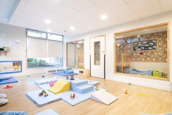La crèche Les Bébés Explorateurs de Jouffroy est un espace lumineux de 218 m² avec salle de motricité, dont les dortoirs au papier peint koalas et le patio intérieur en font un lieu de vie doux et singulier dans le 17e arrondissement.