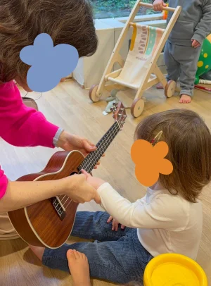 Dans la crèche de Jouffroy, une petite fille participe à un atelier musical avec l'association partenaire : écouter, reproduire un rythme, chanter en groupe — une initiation à la musique joyeuse qui développe l'oreille et l'expression des tout-petits.