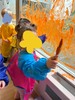 Les enfants de la crèche du 17e peignent directement sur une vitre avec leurs pinceaux et leurs doigts : une expérience créative unique où la transparence du support révèle la lumière et invite à une expression sans limites.