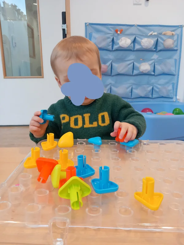 À la crèche du 18e, les enfants développent leur motricité fine à travers des jeux de couleurs : trier, assembler, superposer des jouets multicolores — une activité simple et précieuse pour affiner la coordination main-œil.