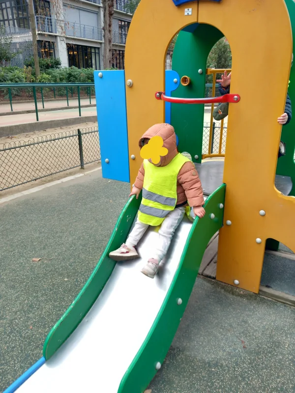 Sortie au parc pour les explorateurs de Marcadet ! Glisser sur le toboggan sous le regard bienveillant de l'équipe, c'est développer confiance en soi et sens de l'équilibre dans un cadre naturel et joyeux.