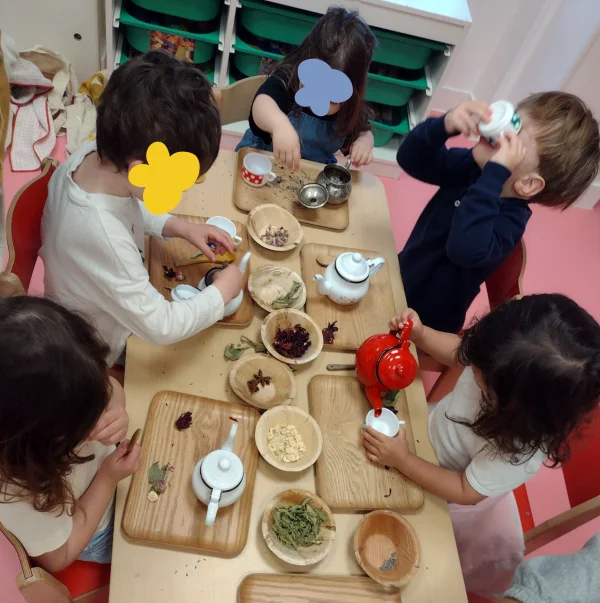Dans la crèche du 9e, les enfants jouent à "l'heure du thé" avec leur service à tisane : verser, souffler, partager… un jeu de rôle symbolique qui développe le langage, l'imitation et les premières interactions sociales des tout-petits.