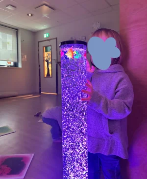 Bulle sensorielle snoezelen à Saint-Herblain : une petite fille, apaisée, observe une lampe à lumière douce — un moment de calme et d'exploration multi-sensorielle.