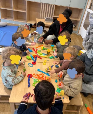 Atelier pâte à modeler en groupe : les petites têtes curieuses de Vanves façonnent, partagent et s'entraident — un moment de motricité fine et de vie collective.