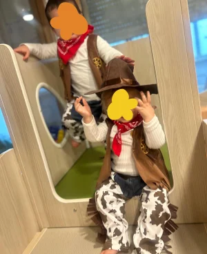 Carnaval façon Far West à la crèche de Vanves : deux petits aventuriers affichent fièrement leurs tenues de cow-boy, prêts pour une journée pleine de joyeux chahut.