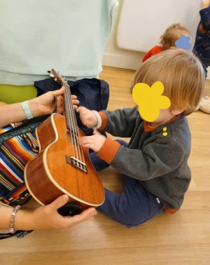 Éveil musical à la crèche de Saint-Herblain : une musicienne en visite guide les bambins vers la guitare, les invitant à toucher les cordes et à s'émerveiller du son.