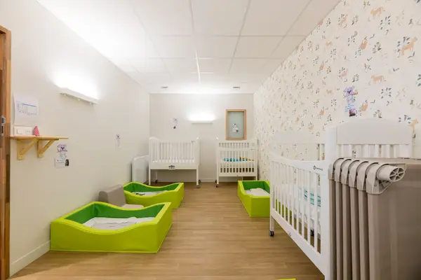 Avec ses 200 m² intérieurs et ses 50 m² de jardin, la micro-crèche de Saint-Herblain offre à 12 enfants de 2 mois et demi à 3 ans un espace de vie remarquablement généreux. Les pièces sont organisées pour favoriser à la fois l'éveil et la tranquillité : une zone de jeu animée avec structures à grimper, un coin bricolage avec seau de vis et écrous adaptés aux petites mains, et un espace calme réservé aux siestes.